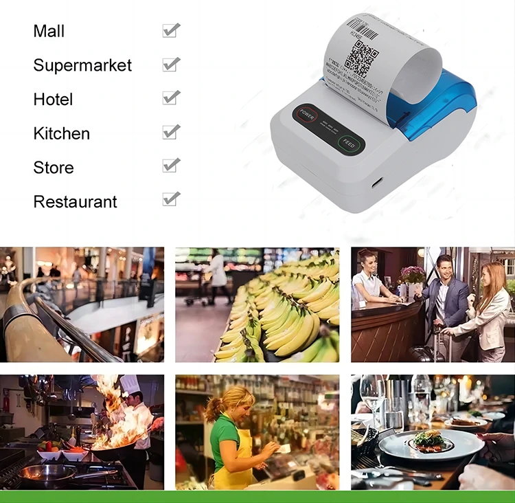 Термалды Bluetooth сымсыз сиясыз принтерлер барған сайын танымал болып келеді және бөлшек сауда, қоғамдық тамақтандыру, логистика және денсаулық сақтау сияқты көптеген салаларда кеңінен қолданылады. Бөлшек сауда индустриясы оны сатып алу түбіртектерін жылдам басып шығару үшін пайдалана алады. Қоғамдық тамақтандыру саласында ол тапсырыстарды бірден басып шығара алады. Логистика индустриясында ол жедел жеткізу белгілерін басып шығара алады. Медициналық индустрияда ол медициналық жазбалар мен рецепттерді басып шығара алады. Бұл қолданба сценарийлерінің барлығы термиялық Bluetooth принтерлерінің жоғары тиімділігі мен практикалық мүмкіндіктерін көрсетеді.