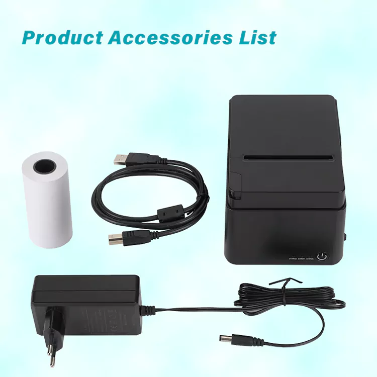 1. Пакет мыналарды қамтиды: 80 мм түбіртек принтері, қағаз орамы, USB кабелі, нұсқаулықтар, адаптер.